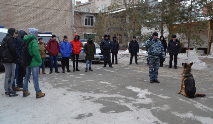 Знакомство с профессией сотрудников патрульно-постовой службы началось с экскурсии по административному зданию. Ребятам показали разнообразие автотранспорта полиции. После чего учащиеся увидели инсценированное задержание преступника с помощью работы кинолога, который координирует служебную собаку.