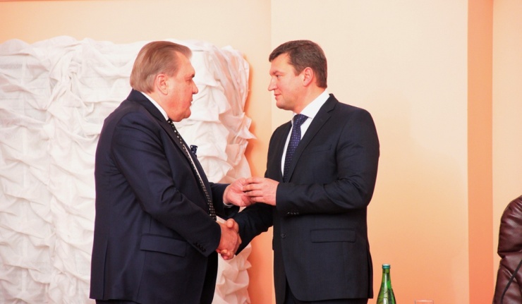 Нагрудный знак Главы города вновь избранному Главе вручил Почетный гражданин Оренбурга Юрий Мищеряков.