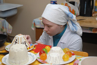 По старинным рецептам были приготовлены пасхи разных видов, среди которых заварные. Каждая из них красиво оформлена: студенты аккуратно вывели причудливые узоры и украсили разноцветными драже.