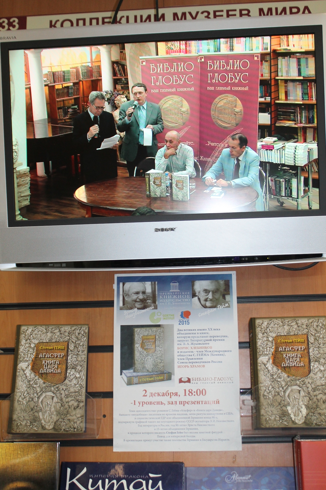 Символичным получилось вчерашнее мероприятие в столичном «Библио-Глобусе», которым Оренбургский благотворительный фонд «Евразия» завершил Год литературы в России. 10 лет назад по приглашению президента крупнейшего книжного магазина Москвы Бориса Есенькина «Евразия» представила в ТД «Библио-Глобус» двуязычное издание – протоколы допросов антифашиста Александра Шмореля в гестапо. Эта книга и по сей день, выдержав два издания, успешно продается в столице, и именно это русско-немецкое издание получил на вечере в подарок почетный гость мероприятия – Полномочный министр и Постоянный представитель Посла Германии в России Андреас Майтцнер. Он выступил с речью по случаю презентации двух романов выдающегося немецкого романиста Стефана Гейма «Агасфер» и «Книга царя Давида», выпущенных Оренбургским книжным издательством им. Г.П. Донковцева.