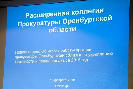В прокуратуре Оренбургской области состоялось расширенное заседание коллегии по итогам работы в 2015 году. В работе коллегии приняли участие губернатор Юрий Берг, начальник Управления Генеральной прокуратуры Российской Федерации в ПФО Александр Белых, главный федеральный инспектор по Оренбургской области Сергей Гаврилин, руководители судебных, и правоохранительных ведомств региона, территориальные и специализированные прокуроры области.