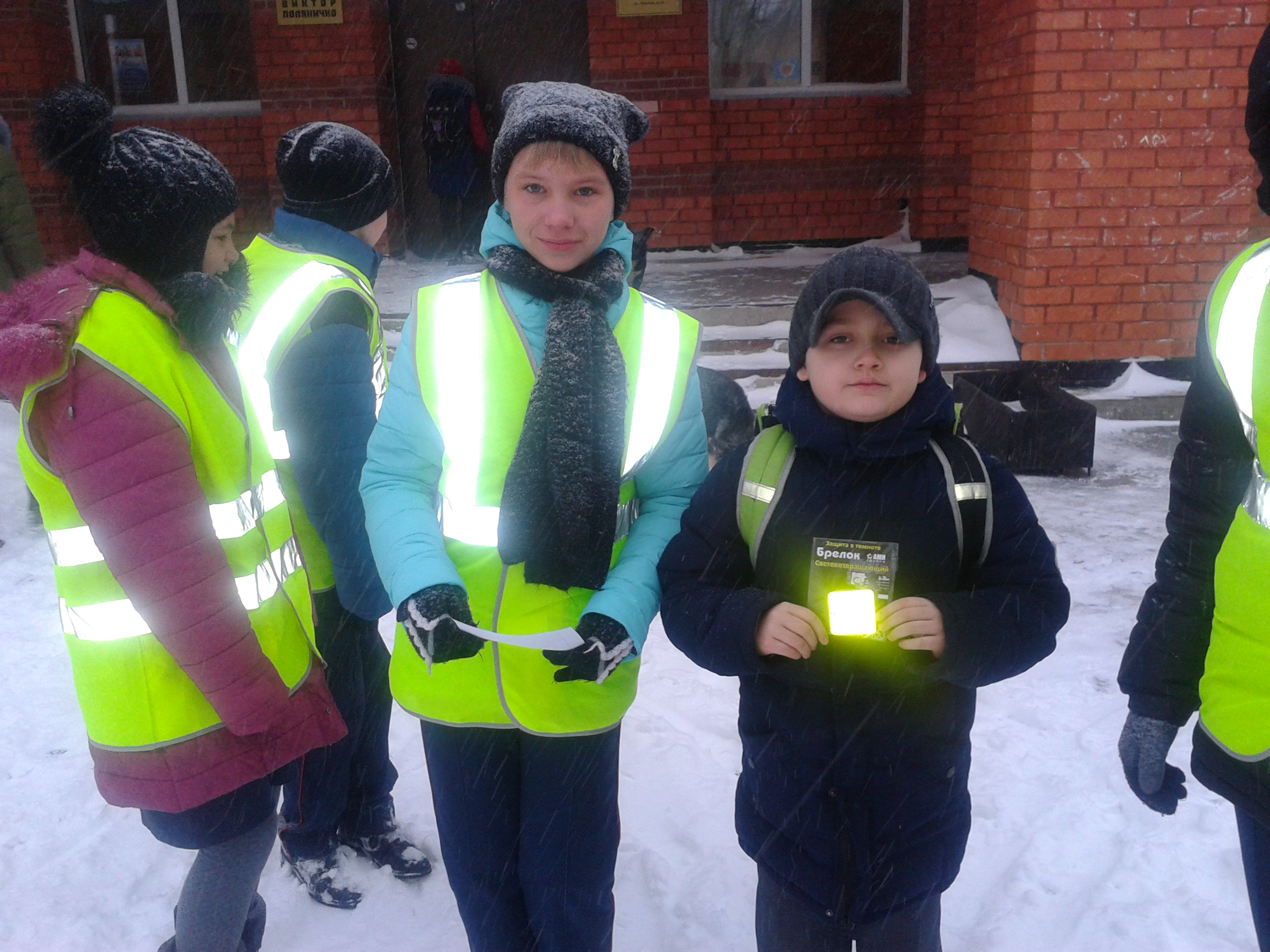 Перед началом занятий активисты кадетского класса Коломойцев Артем, Запара Виктория, Табуйко Мария, Землянкин Максим и Кутлембетова Ильмира с инспектором ОГИБДД старшим лейтенантом полиции Вадимом Нияниным, надев светоотражающие жилеты, принялись патрулировать на пешеходных переходах, расположенных вблизи школы, помогая самым маленьким школьникам перейти дорогу. Встретив первоклассников, участники акции проводили с ними беседу о применении светоотражателей на одежде, а после этого дарили фликер с листовкой по Правилам дорожного движения для детей.