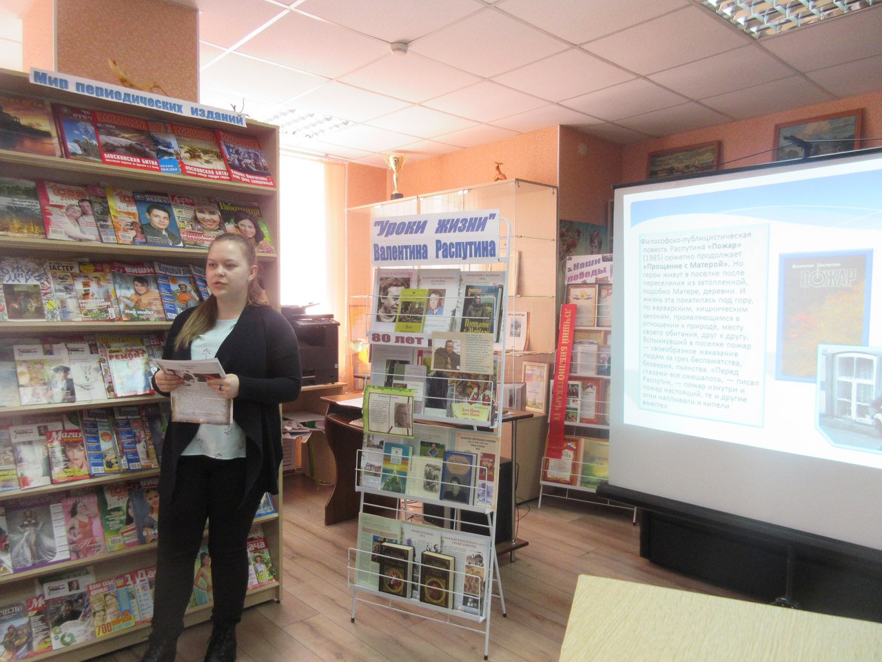 На книжно-иллюстрированной выставке «Уроки жизни Валентина Распутина» были представлены книги писателя и журналы, рассказывающие о его творческом пути, был показан видеоролик о Валентине Распутине, созданный библиотекарем Трифоновой О.Н. Все выступления сопровождались слайдами презентации "Жить по совести".