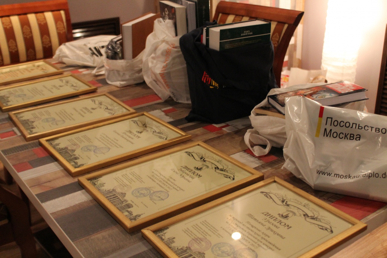 Присутствующих приветствовал заместитель министра культуры и внешних связей Оренбургской области Александр Калинин. Вместе с президентом Оренбургского благотворительного фонда «Евразия» Игорем Храмовым он вручил дипломы и призы Светлане Замлеловой из Сергиева Посада – писательнице, редактору сетевого литературного журнала «Камертон» и Евгении Ярославцевой – преподавателю Московского суворовского военного училища – победителям в номинации «английский язык». За перевод с немецкого наград были удостоены Елена Зубаровская, прилетевшая из Крыма, и преподаватель математики из Орска Татьяна Уразова. Дмитрий Арш – переводчик-фрилансер из Самары, занявший в прошлом году третье место в итальянском языке, поднялся в этом году на вторую призовую ступеньку. А аспирант филологического факультета Санкт-Петербургского государственного университета Егор Бычков был отмечен поощрением жюри за перевод поэтического произведения с испанского языка.