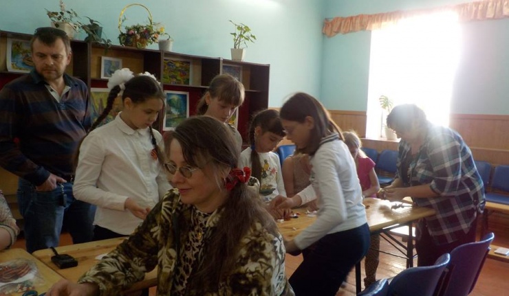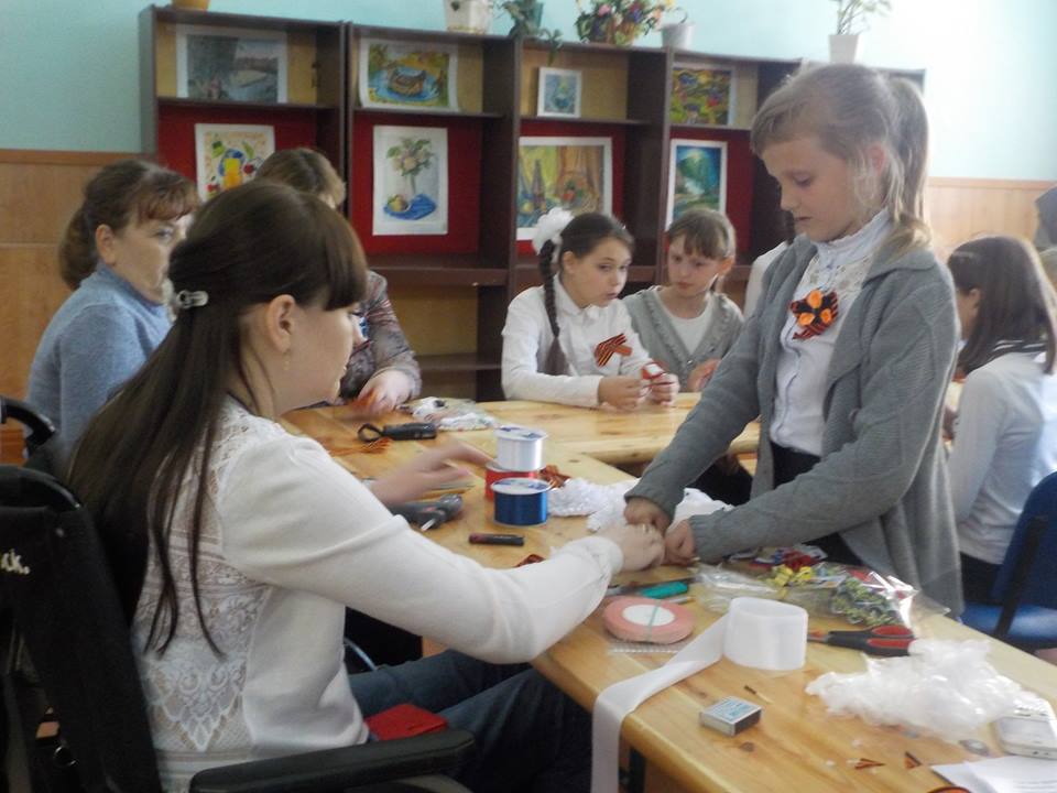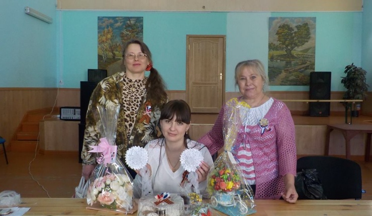 "Георгиевская лента своими руками" с элементами канзаши - мастер - класс от Валентины Складчиковой. Мастер – класс был организован председателем Совета женщин села П-Покровка, сельской библиотекой. Мастер – класс был проведен в малом зале Дома культуры.