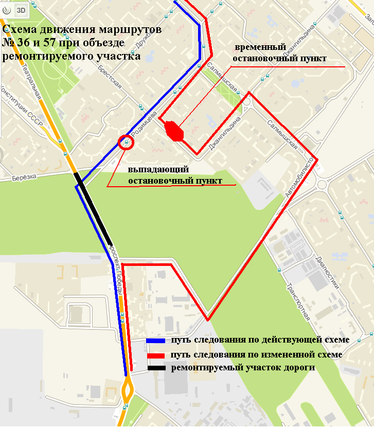 Маршруты №№ 45, 63, 52, 107 при движении в центр будут объезжать данный участок дороги по улицам: Театральная – левый поворот на ул. Родимцева – ул. Брестская – ул. Джангильдина – ул. Салмышская – ул. Автомобилистов – ул. Транспортная – левый поворот на пр. Победы – далее по действующей схеме движения.