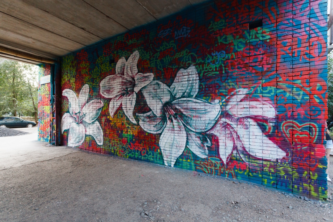 А напоследок художники из Екатеринбурга Александр Галешников и Олег Скворцов вместе с жителями Оренбурга создали стену желаний в арке дома на ул. Чкалова, 26. В создании арт-объекта приняли участие больше полусотни человек, многие из которых приложили руку к созданию арт-объекта, написав на стене свое заветное желание. Паттерн из текста стал фоном для больших белых лилий, которые нарисовал художник Александр Галешников.