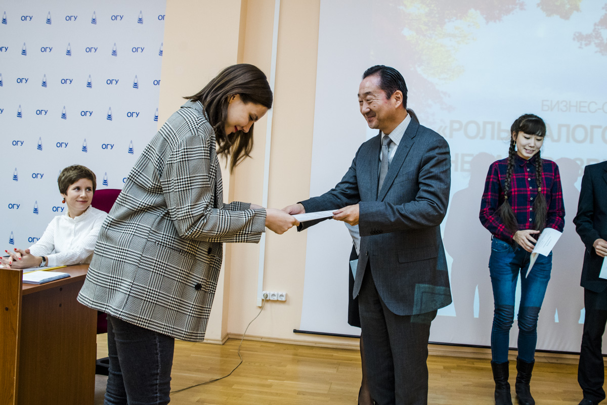 На бизнес-семинаре, который стал завершающим мероприятием фестиваля, Ивао Охаси и руководитель Японского информационного центра ОГУ Людмила Докашенко вручили сертификаты студентам ОГУ, посетившим в этом году Летнюю научную школу Университета Хиросимы.