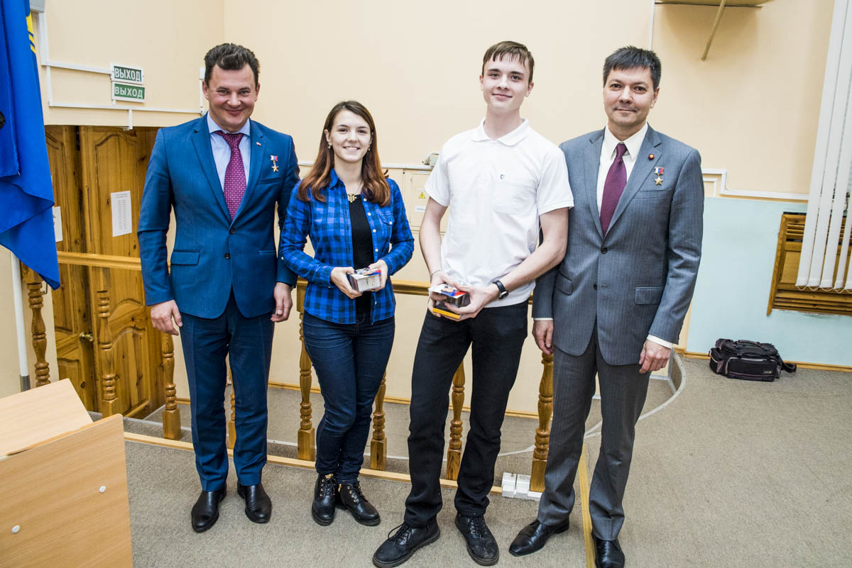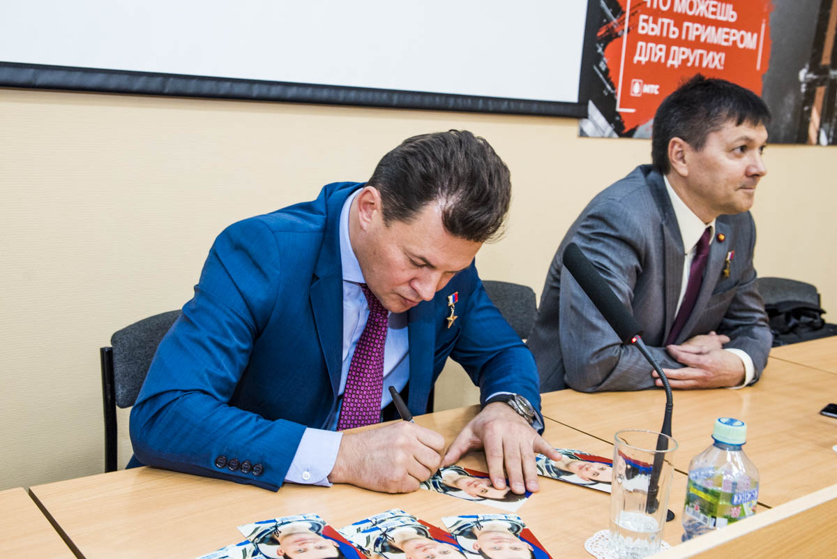 В рамках встречи два лучших вопроса были отмечены подарками от героев России. Также все студенты получили фотокарточки космонавтов с автографами и долго фотографировались.