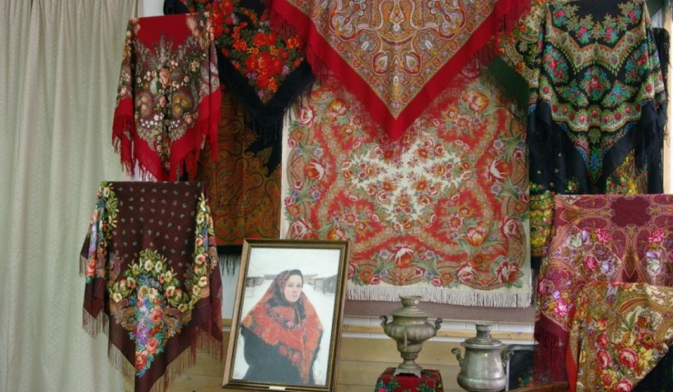 Платки России - это, конечно, павловопасадские платки. В центре композиции выставки представлены павловопасадские платки, полученные в дар музею от главного художника Павловопосадской платочной мануфактуры Виктора Ивановича Зубрицкого и оренбургского скульптора Надежды Гавриловны Петиной.