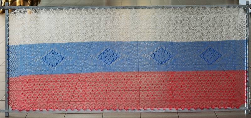 Из поколения в поколение народное искусство передаёт в творчестве истинных мастеров ценностное отношение к жизни, к человеку, к своей Родине. Все перемены, которые происходят в стране, таки или иначе находят своё отражение в творчестве оренбургских вязальщиц - это подтверждает наша праздничная экспозиция. Зрители увидят платок О. Фёдоровой 1984 г с изображением герба Советского Союза, выполненный к 60-летию СССР, платок Л. Губайдулиной 2015 г. с гербом Российской Федерации и произведение А. Биктагировой – «Триколор» 2018 г. Образ российского флага - один из официальных государственных символов Российской Федерации.