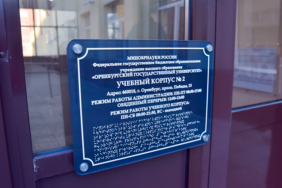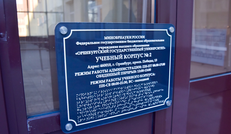Также для них создана специальная версия сайта ОГУ, установлены рельефные знаки о путях движения и наличии препятствий, высококонтрастные названия кабинетов, телефон с крупными кнопками в холле корпуса № 2, мнемосхема - тактильная рельефная карта помещения с указанием путей следования, целевых зон для инвалидов. На ней с помощью выпуклых букв и шрифта Брайля также отображается информация о названии и назначении помещений.