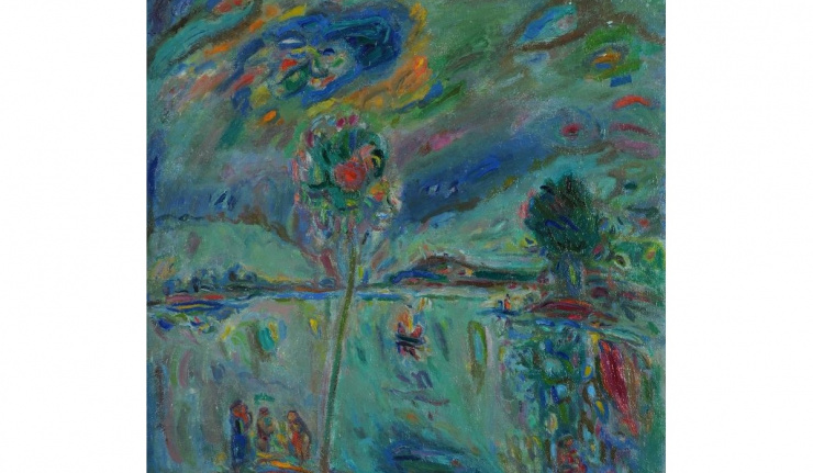 Практически сюжеты в его картинах отсутствуют, действия либо нет, либо оно бесконечно, к минимализму сведены будничные, бытовые реалии времени. Течение жизни, ее пластическая формула – вот содержание работ художника. В композиционных схемах картин отсутствует линия горизонта, место изображения параллельно плоскости работы, как бы увидено сверху. Пейзажный фон картин условен, изображение стилизовано, так что только по угадываемым деталям – дерево, полумесяцы лодок – можно говорить о реке, береге, пляже, все это скорей намек, символ, что обуславливает неземной, вселенский характер изображения.