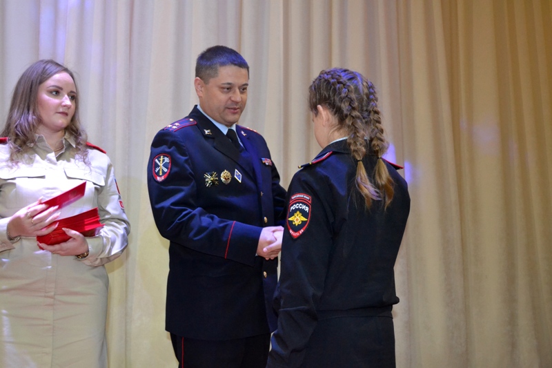 Андрей Олегович совместно со старшим психологом отдела по работе с личным составом МУ МВД России «Оренбургское» Ксений Цыгулевой поздравили присутствующих ребят и подарили всем кадетам сладкие подарки с изображением полицейского шеврона.