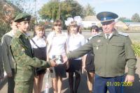По окончании праздничной линейки сотник Николай Колоша и сотник Геннадий Севтаев торжественно вручили командиру кадетского класса, девятикласснику Александру Чаплыгину двадцать комплектов кадетских погон.