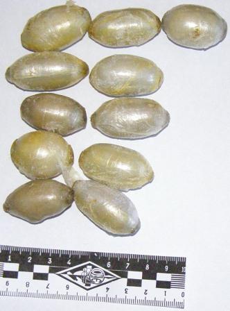 В ходе проведения рентгенографии, в его желудке было обнаружено и впоследствии изъято 11 капсул овальной формы с сыпучим веществом внутри, которые он переместил из Республики Таджикистан.