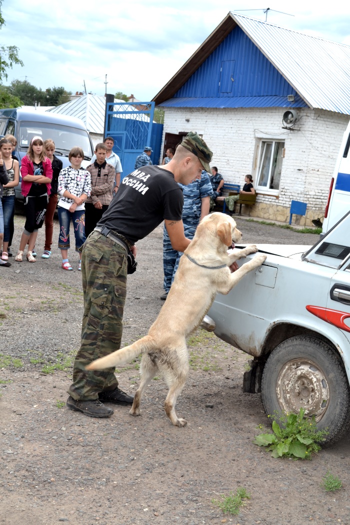 После этого кинологи со служебно-разыскными собаками продемонстрировали свои навыки по выборке вещи и выборке человека, как быстро они находят взрывоопасные предметы при осмотре имитируемого багажа, показали общий курс дрессировки, в том числе выполнение собакой команд по жестам руки и голосу.