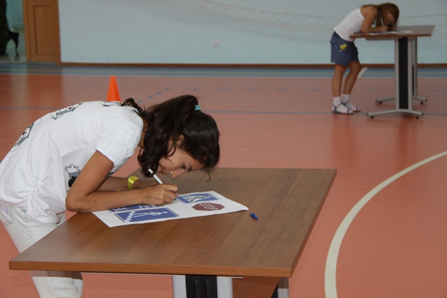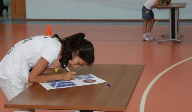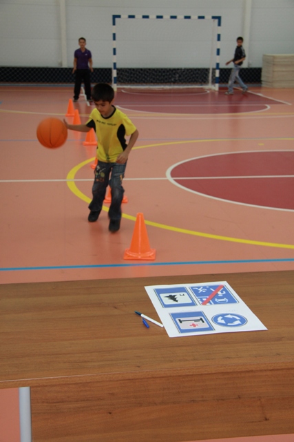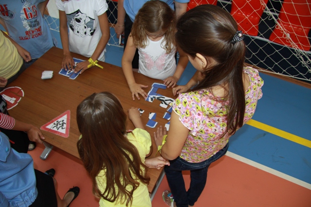 После этого для ребят в спортивном зале были проведены эстафеты, в ходе которых после преодоления бегом дистанции необходимо было собрать пазлы – разрезанные дорожные знаки и объяснить их предназначение, а другие участники отгадывали загадки и в качестве отгадки должны были нарисовать дорожные знаки.