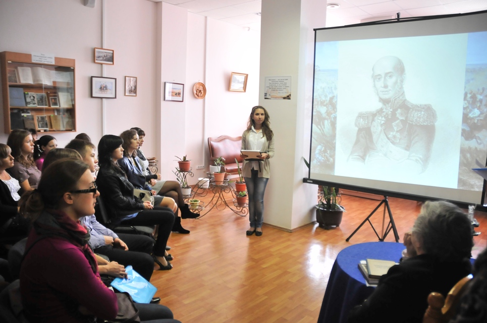 12 сентября в научной библиотеке Оренбургского государственного университета прошла литературная гостиная, посвященная 200-летию Отечественной войны 1812 года. Мероприятие было организованно отделом редких и ценных книг научной библиотеки ОГУ. На встречу со студентами-гуманитариями - журналистами, филологами, историками - пришла известный оренбургский краевед, доктор физико-математических наук, профессор, член-корреспондент АН УзССР , действительный член Международной академии истории науки, член Союза писателей России Г.П. Матвиевская. Галина Павловна не только напомнила присутствующим о событиях 1812 года, но и рассказала об участии Оренбургского края в Отечественной войне.