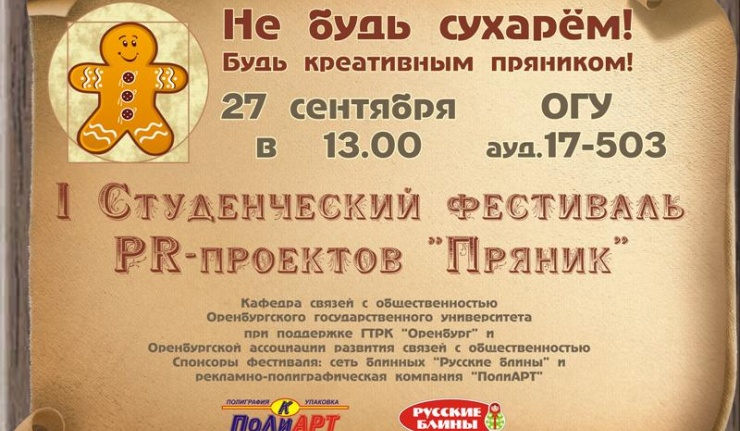 27 сентября 2012 года в 13:00 (ауд. 170503) состоится церемония награждения победителей I Студенческого фестиваля PR-проектов «Пряник». Организатором фестиваля является кафедра связей с общественностью факультета журналистики ОГУ. Идею создания и проведения фестиваля поддержали сеть блинных «Русские блины» и рекламно-полиграфическая компания «ПолиАРТ».