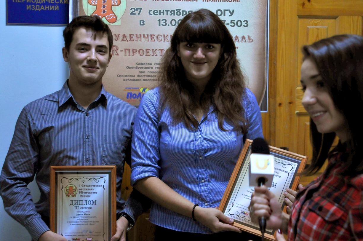 Лучшим PR-проектом в коммерческой сфере признан проект студентки 5-го курса Анастасии Смирновой, обучающейся по специальности «Связи с общественностью», «Отпуску зеленый свет». Проект продвижения научно-практической конференции «Позиционирование региона: проблемы, опыт, тенденции» выпускницы кафедры связей с общественностью Наталии Политики стал победителем в некоммерческой сфере. Лучшим в номинации «Внутрикорпоративный PR-проект» признан «Центр притяжения» Вероники Колпаковой, выпускницы этой же кафедры. В номинации «Самый креативный проект» высокую оценку жюри получил проект «Кот Семен», представленный пятикурсницей Екатериной Николаевой (специальность «Связи с общественностью»). Лучшим среди PR-проектов с использованием интернет-технологий признан проект выпускницы кафедры связей с общественностью Марии Бычковой «Достоверно и онлайн», разработанный для ГТРК «Оренбург». Двое призеров – Н. Политика и В. Колпакова трудятся сегодня в управлении по СМИ ОГУ.