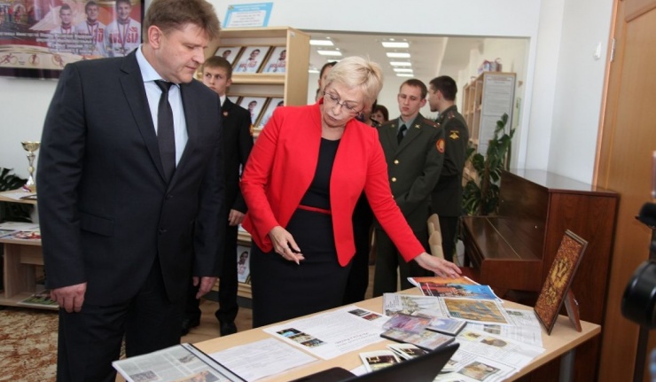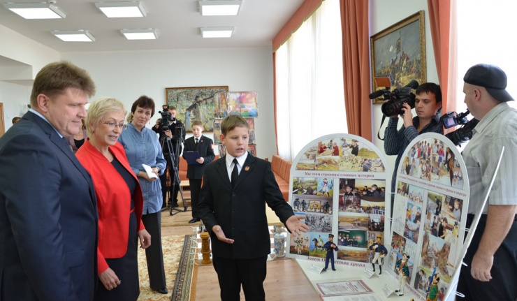 В библиотеке Сергею Гаврилину кадеты продемонстрировали работы, отобранные для участия в Выставке творчества и достижений воспитанников довузовских учебных учреждений Министерства обороны РФ, которая пройдёт 26-27 октября 2012 г. на базе Санкт-Петербургского Суворовского училища.