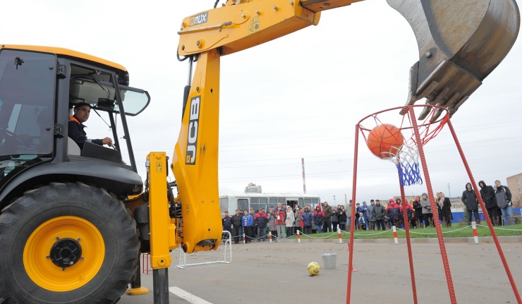 Так, к примеру, проявить мастерство владения баскетбольным и футбольным мячами пришлось машинистам экскаваторов. В первом конкурсе машинистам большого и малого экскаваторов было предложено, сидя за рулем, взять ковшом мяч с подставки, повернуть на 90 градусов и забросить его в баскетбольное кольцо. Затем забить ковшом экскаватора гол в ворота шириной один метр. В третьем испытании – взять зубом ковша ведро с водой, повернуть на 90 градусов и поставить его на пьедестал, в круг. Максимальное количество баллов в этом конкурсе начислялось в случае, если ведро было поставлено в круг, а вода при этом не расплескалась (допускалась потеря воды не более 3 см от первоначального уровня).