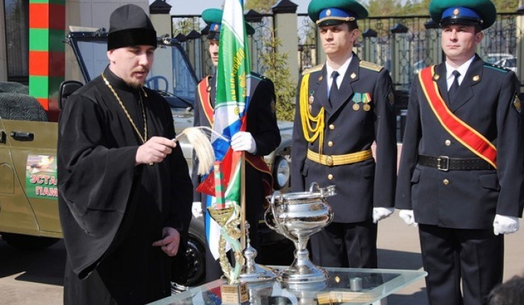 Священник Вадим Татусь провел обряд освящения символов эстафеты и вместе с имамом Альфитом Шариповым благословили эстафетную группу и всех сотрудников Пограничного управления на ратную службу по охране государственных рубежей нашей страны.