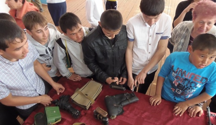 каски. Не остались равнодушными и девчонки, которые вместе с ребятами рассматривали выставку, восторгаясь представленной возможностью подержать настоящее оружие в руках.