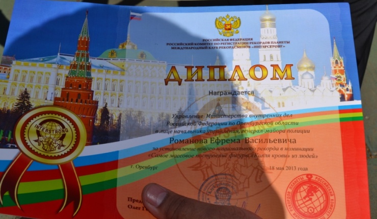 7018 человек, в красных майках, собрались на стадионе «Динамо» и построили фигуру капли крови. Среди собравшихся было 500 сотрудников органов внутренних дел. В акции принял участие начальник УМВД России по Оренбургской области генерал-майор полиции Ефрем Романов.