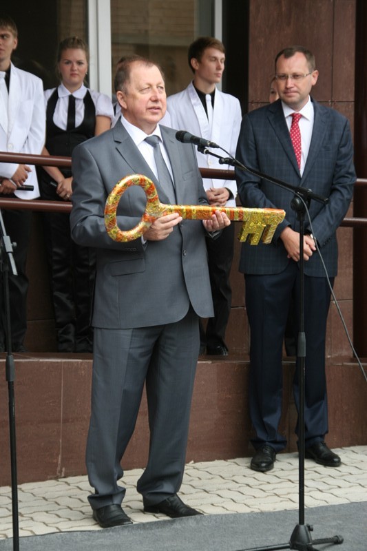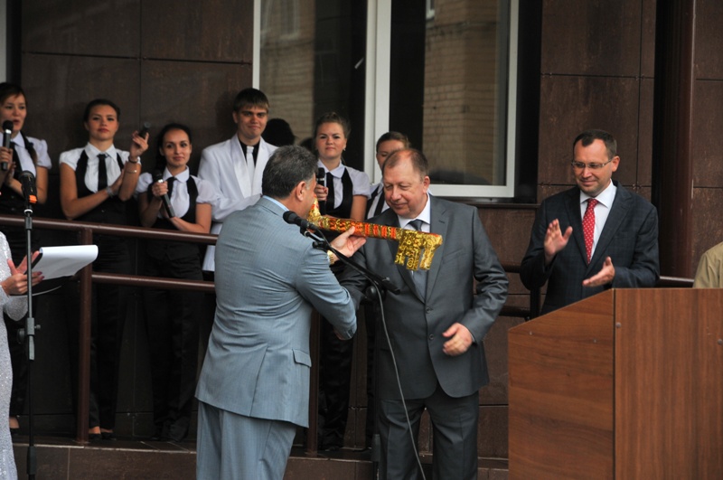 – Строительные технологии, которые использовались при строительстве нового здания, требуют высококвалифицированных специалистов. На новом оборудовании невозможно работать без определенных знаний. Поэтому учитесь, овладевайте всеми необходимыми знаниями и навыками, становитесь профессионалами и приходите к нам на производство, – обратился к студентам О.М. Ситников, после чего вручил ректору ОГУ В.П. Ковалевскому символический ключ от корпуса № 20.