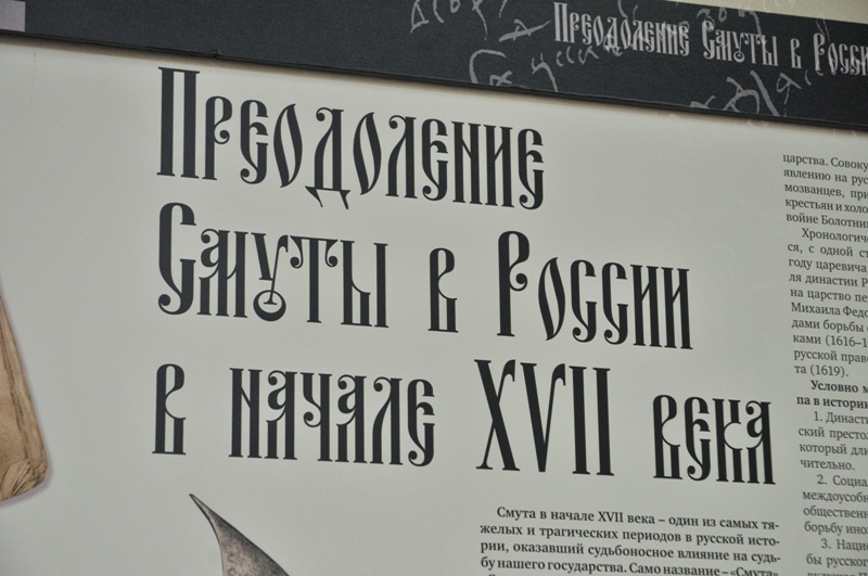 Экспозиция посвящена 400-летию окончания Смуты и началу правления русского царя Михаила Романова. Научный сотрудник Оренбургского губернаторского историко-краеведческого музея М.С. Андреева провела для посетителей экскурсию. Она рассказала об основных этапах данного исторического периода, его роли в развитии Российского государства и представила репродукции гравюр, картин, икон, изображения предметов богослужения, оружия, доспехов, монет и медалей того времени. Все они размещены на тридцати девяти выставочных планшетах. Особое внимание Мария Сергеевна уделила редким архивным документам, часть которых впервые показана широкой публике. Их оригиналы хранятся в Российском государственном архиве древних актов. При этом самый важный из них – первый свод законов России – Соборное уложение.