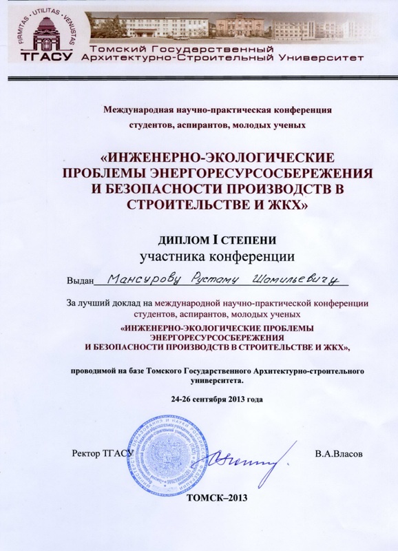Заведующий кафедрой теплогазоснабжения, вентиляции и гидромеханики ОГУ Р.Ш. Мансуров получил диплом I степени за доклад на Международной научно-практической конференции студентов, аспирантов, молодых ученых «Инженерно-экологические проблемы энергосбережения и безопасности производств в строительстве и ЖКХ». Конференция проходила с 24 по 26 сентября в Томском государственном архитектурно-строительном университете. В течение трех дней ученые из вузов Томска, Оренбурга, Волгограда, Новосибирска, Иркутска, Красноярска и других городов обсуждали актуальные проблемы, связанные с проектированием, эксплуатацией, модернизацией, аудитом и экспертизой объектов жилищно-коммунального хозяйства.