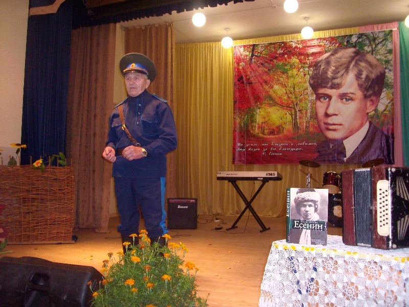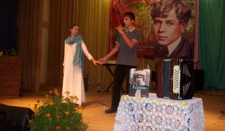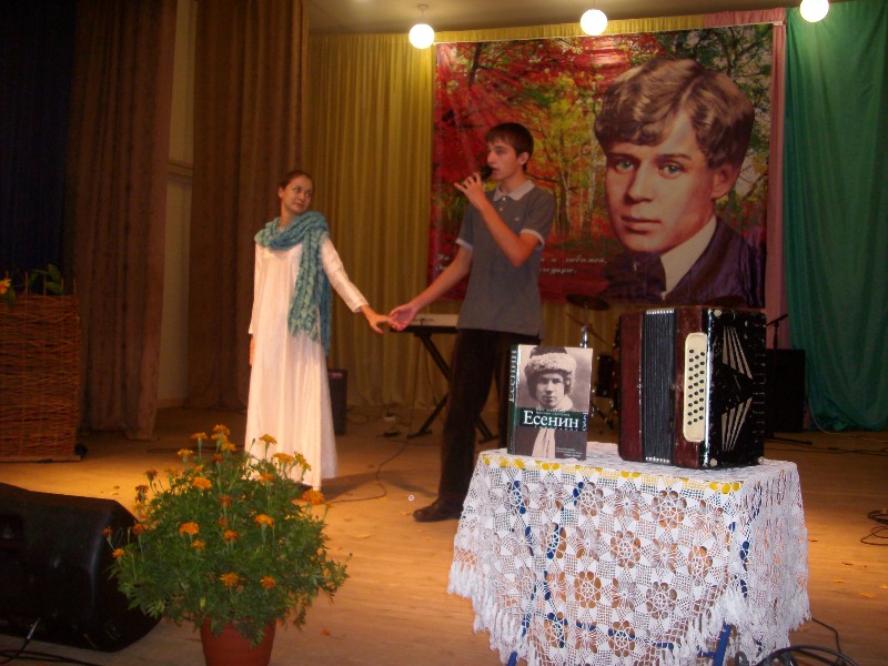 Порадовали всех чтецы – учащиеся Подгороднепокровской средней школы, ученики 10-11 классов: Боков Саша, Федоров Иван, Комиссарчук Андрей ( он сыграл роль взрослого С.Есенина), Редько Елена, Филатова Инна и многие другие. Заворожил всех зрителей танец Айседоры Дункан в исполнении руководителя бальными танцами Светланы Владимировны Татарченко, и конечно очаровал почитателей есенинской поэзии маленький Сережа. Одетый в «есенинскую» косоворотку, в исполнении Камалина Степана, ученика 4 класса. Проникновенно исполнил стихотворение «Письмо к матери» одиннадцатиклассник Саша Ильин. Миша Степанов так прочитал стихотворение «Гой ты, Русь, моя родная…», что заключительные строки уже прозвучали в громе аплодисментов…