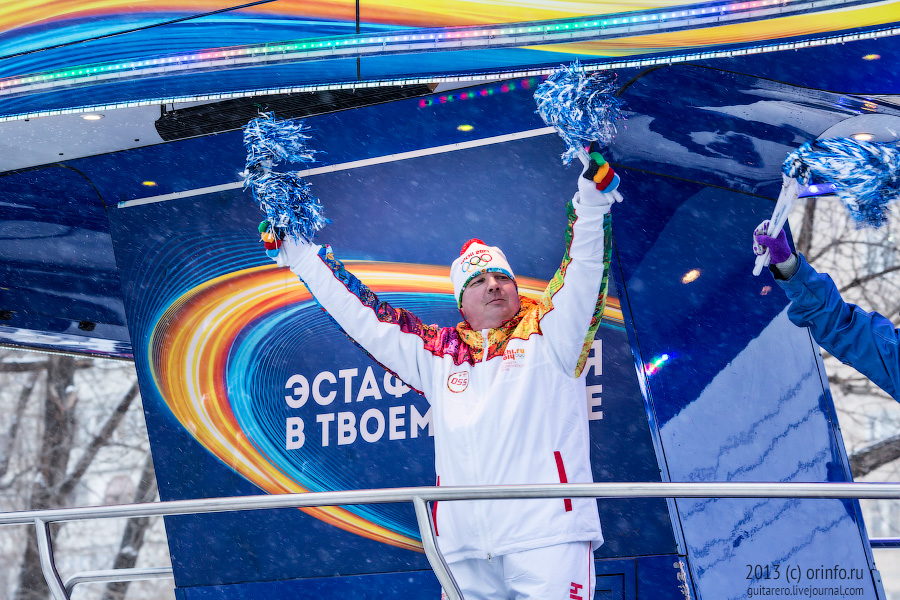 В 18:50 Огонь Олимпийских игр 2014 года оказался в руках первого Героя Российской Федерации, удостоенного этого звания за сельский труд, члена Общественной палаты Оренбургской области Вячеслава Чернухи.