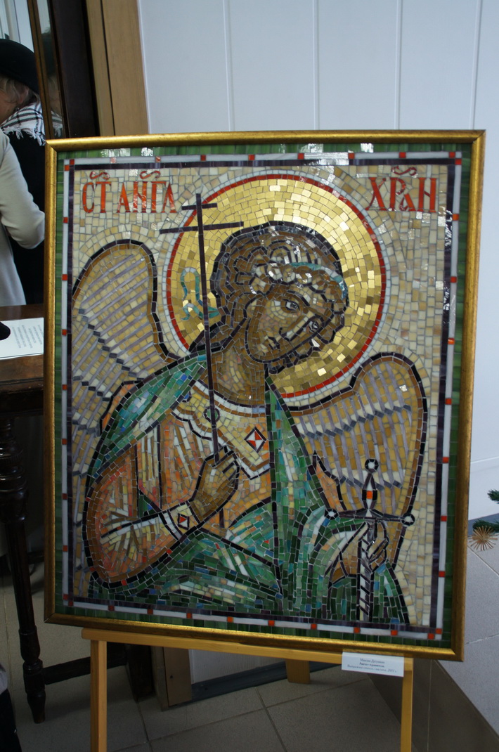 Берестяные, соломенные, пряничные, глиняные, стеклянные, бумажные, шитые, вязанные – обилие техник, идей и материалов, простор для вдохновения мастериц и художников. Один из популярных материалов на выставке – стекло. В витринах прозрачные, изящные колокольчики и статуэтки, сквозь которые можно разглядеть даже вид из окна. Но показали на выставке и другую разновидность этого материала, которую не часто встретишь в наших экспозициях. Из опалового стекла сделал своего мозаичного ангела художник, преподаватель художественного училища Максим Дугушкин.