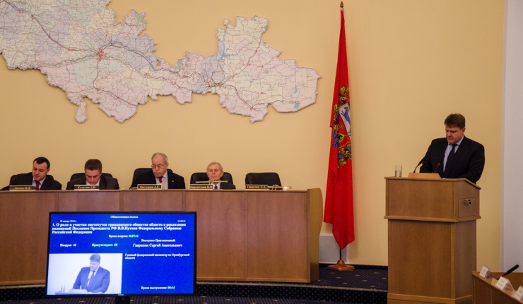 Весь богатейший спектр мнений должен быть не только учтён, но и использован в управлении регионом, каждым городом и посёлком. Сергей Гаврилин 30 января 2014 года принял участие в пленарном заседании Общественной палаты Оренбургской области. Главным в повестке дня был вопрос «О роли и участии институтов гражданского общества в реализации положений Послания Президента РФ Федеральному Собранию Российской Федерации». На мероприятие также были приглашены: вице-губернатор - заместитель председателя правительства - руководитель аппарата губернатора и правительства Оренбургской области Дмитрий Кулагин; вице-губернатор - заместитель председателя правительства области по внутренней политике Олег Димов; начальник регионального Управления Министерства юстиции Российской Федерации Татьяна Ганина; координатор ОНФ в Оренбургской области Владимир Канюков; председатель Оренбургской областной украинской культурно-просветительской общественной организации имени Т.Г.Шевченко Николай Науменко; муфтий Духовного управления мусульман области Барый Хайруллин и другие официальные лица.