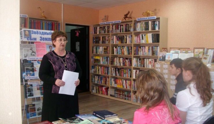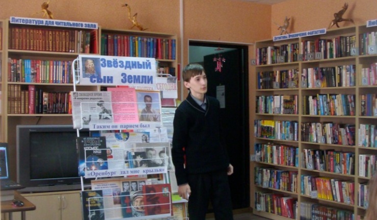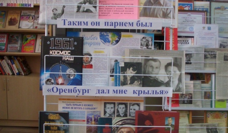 В библиотеке были оформлены книжные выставки: «Звёздный сын Земли», «Он в Оренбурге встал на звёздное крыло», на которых представлен богатый книжный и газетно-журнальный материал о космонавтике, первопроходце космоса, о годах учёбы Ю.А.Гагарина в Оренбургском высшем военном лётном училище. "Оренбург дал мне крылья" - так говорил Ю.А.Гагарин о нашем городе. В нашем городе бережно хранят все, что связано с годами, проведенными здесь Гагариным. Именно здесь Юрий встретил свою любимую девушку – Валю Горячеву, будущую жену космонавта. Именно в Оренбурге он создал свою семью. Многое в Оренбурге напоминает о первом космонавте страны. Любимое место прогулки летчиков - курсантов - набережная реки Урала, а совсем недалеко, на улице Чичерина, квартира матери Валентины Гагариной, где некоторое время жила молодая семья. Теперь здесь музей-квартира. Сохранились вещи, многие из которых передала музею Валентина Ивановна Гагарина. У присутствующих была возможность получить ещё много полезной информации из двух тематических папок, в которых собраны за многие годы статьи, заметки о космосе и героях, покоряющих его.