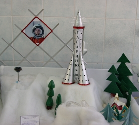 Тема 80-летия со дня рождения Ю.А.Гагарина раскрыта в технических композициях со светящимися и двигающимися элементами: