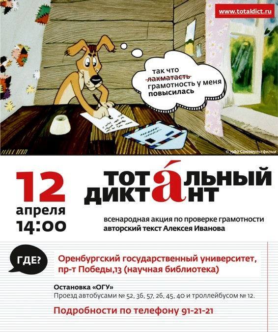В Оренбурге писать диктант будут в аудиториях научной библиотеки ОГУ. Для того чтобы стать участником проекта, необходимо зарегистрироваться на сайте ОГУ или по телефону 91-21-21. Регистрация на официальном сайте «Тотального диктанта» – http://totaldict.ru будет открыта за 10 дней до его проведения.