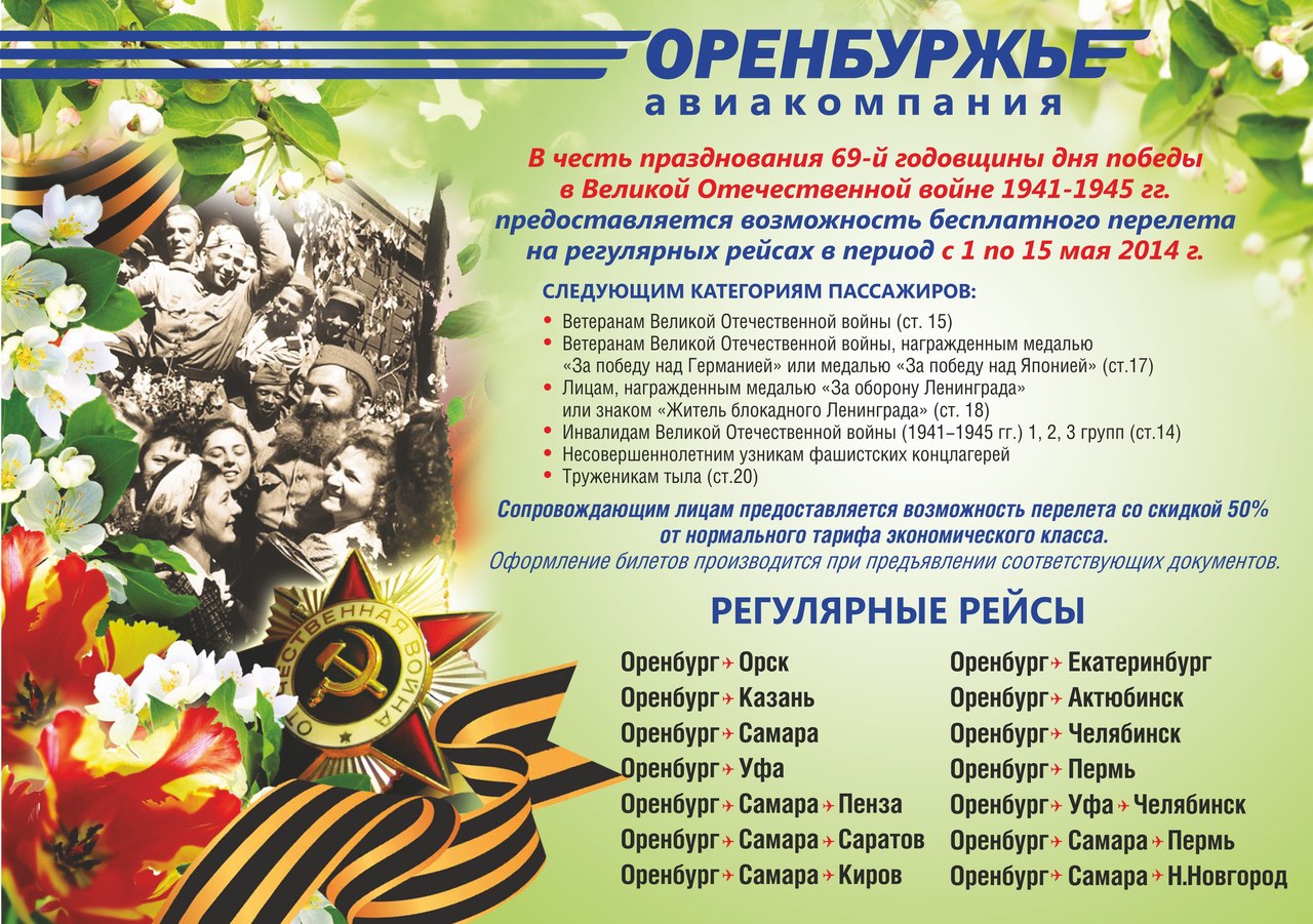 Авиакомпания «Оренбуржье» в преддверии Дня Великой Победы 9 мая напоминает о действующей с 1 по 15 мая акции «Ветеран». Участники Великой Отечественной войны могут воспользоваться бесплатным перелетом по маршруту «туда-обратно» или в одну сторону по любому регулярному рейсу авиакомпании «Оренбуржье».