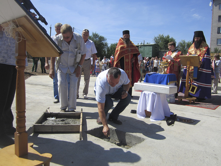 В закладке первого камня над алтарной частью храма приняли участие представители администрации города, благодетели и прихожане, которые укладывали цементный раствор.