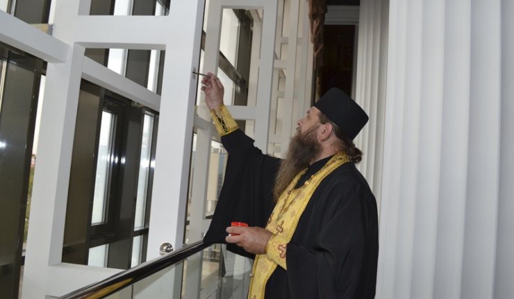 В своих молитвах священнослужители молитвенно призывали Божие благословение на дом и трудящихся в нем, на их христианскую жизнь и совершение добрых дел. На стенах драмтеатра святым елеем были начертаны кресты, а залы, комнаты и сцену окропили святой водой. Епископ Ириней благословил театральный коллектив, лично поздравил каждого из присутствующих.