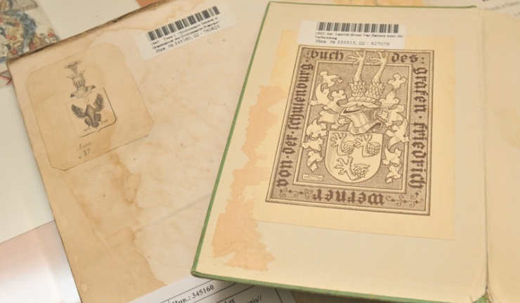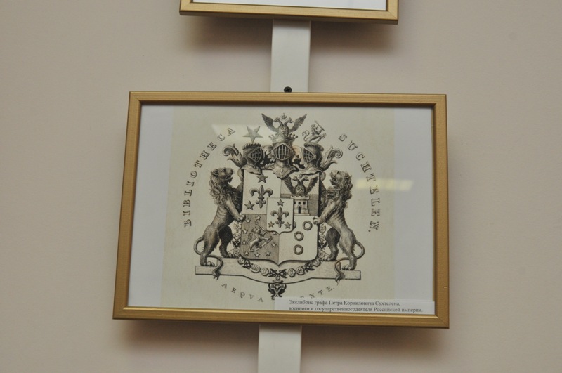 Вниманию посетителей представлены подлинные экслибрисы, среди которых библиографическая редкость – экслибрис Д.С. Лихачева. Большой интерес представляют и фоторепродукции индивидуальных знаков известных людей, например П.П. Сухтелена, графа В.Н. Ламсдорфа, адмирала М.П. Лазарева и др. Все они относятся к гербовым экслибрисам, и каждый из них содержит родовой девиз владельца книжной коллекции. Перевод уникальных фраз с различных языков мира сделан сотрудниками международных программ и проектов ОГУ.