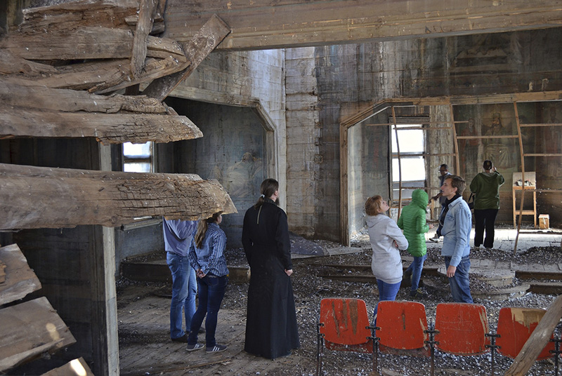 Местные жители поначалу встретили молодых людей с недоверием, поскольку, как они позже объяснили нам, слишком много праздных туристов приезжает посмотреть на церковь. Когда узнали, с какой целью мы приехали, то оказали посильную помощь: пригнали большой бортовой ЗИЛ, в кузов которого ребята начали ссыпать мусор, накопившийся в храме, а также дали бензопилу, чтобы срезать части обвалившегося перекрытия.
