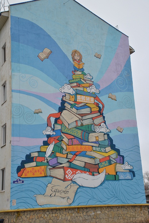В сентябре молодые художники из Оренбурга Дарья Савина, Александр Литвинов и Мария Скопинцева вышли в финал конкурса «Город творчества», набрав наибольшее количество голосов за изображение 25-метрового ангела-хранителя на доме № 22 на улице Родимцева. В финальном творческом состязании художники творили над новым стритартом на тему «Межнациональное единство». Новый рисунок появился на четырехэтажке на улице Даля, 2. За основу рисунка была взята глубокая философская концепция. Маленький ребенок, свободный от «проблем» и «национальных» разногласий взрослых, на вершине пирамиды из книжных фолиантов изучает мир. На корешках книг представлены орнаменты 11 основных национальностей, проживающих в Оренбурге.