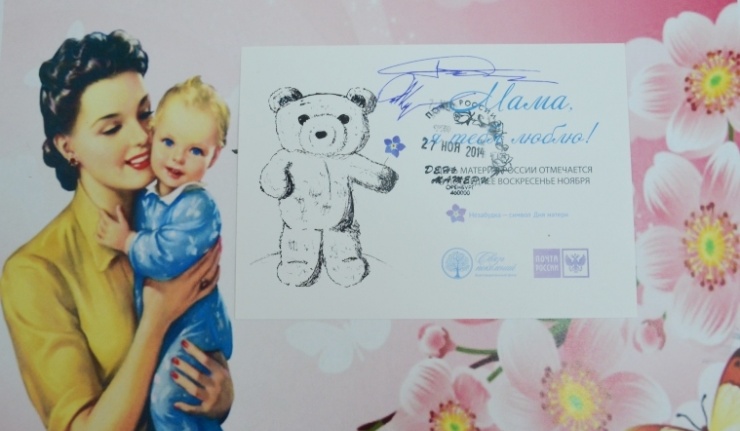 27 ноября УФПС Оренбургской области – филиал ФГУП «Почта России» организовал торжественную церемонию гашения почтовой карточки «Мама я тебя люблю!». Процедура проходила во Дворце культуры и спорта «Газовик» в рамках областного форума «Матери Оренбуржья». Право поставить оттиск штемпеля на почтовую продукцию с символикой праздника Дня матери - плюшевым мишкой и незабудкой представилось вице – губернатору – заместителю председателя Правительства Оренбургской области по социальной политике Павлу Самсонову и руководителю Оренбургского филиала Почты России Роману Цуканову. Погашенную почтовую карточку, с особым изображением, специально разработанным для Всероссийской акции ФГУП «Почта России», участники гашения со словами поздравления вручили министру социального развития Татьяне Самохиной.