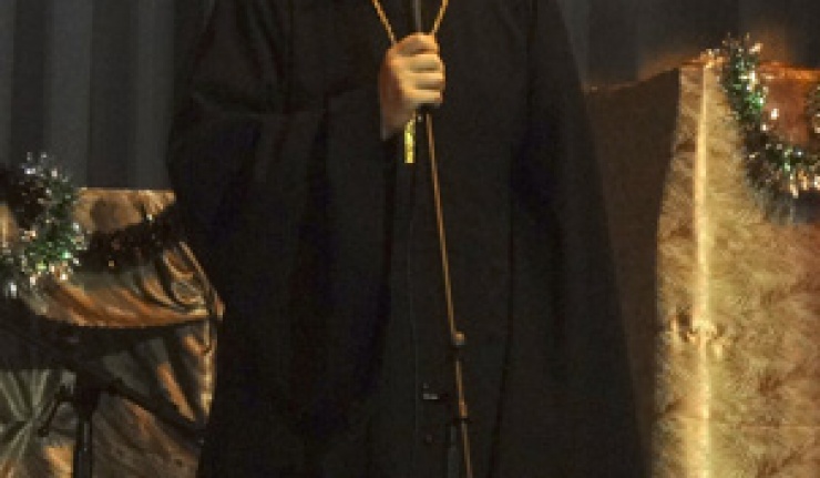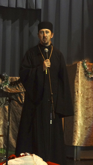 По завершении спектакля на сцену вышел благочинный Кваркенского округа иерей Владимир Бабак. Священник появился в неожиданном для всех виде - в костюме Деда Мороз. И представившись таковым, батюшка сказал, что пришел поздравить ребят с Новым годом. На вопрос: «Новый ли год вы здесь празднуете?», - дети дружно начали кричать: «Нет, Рождество Христово!». А на вопрос : «Кто же на сцене на самом деле?», - ребята ответили: «Батюшка!». Тогда священник снял костюм сказочного героя и сказал, что он действительно не Дед Мороз, а священник, и не с Новым годом пришел поздравить всех, а с Рождеством Христовым. Тем самым батюшка подчеркнул, что Новый год и Рождество - это не одно и то же, и что празднование второго несоизмеримо больше первого.