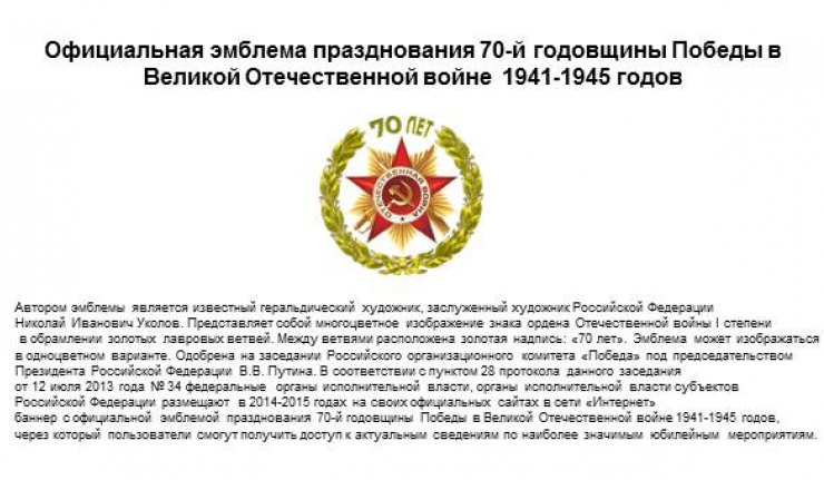 Главный художник города Оренбурга Наталья Бровко рассказала, что официальной эмблемой празднования 70-й годовщины Победы в Великой Отечественной войне 1941-1945 годов станет утвержденная на заседании Российского организационного комитета «Победа» под председательством Президента Российской Федерации В.В. Путина эмблема. Она представляет собой многоцветное изображение знака ордена Отечественной войны I степени в обрамлении золотых лавровых ветвей. Между ветвями расположена золотая надпись: «70 лет».