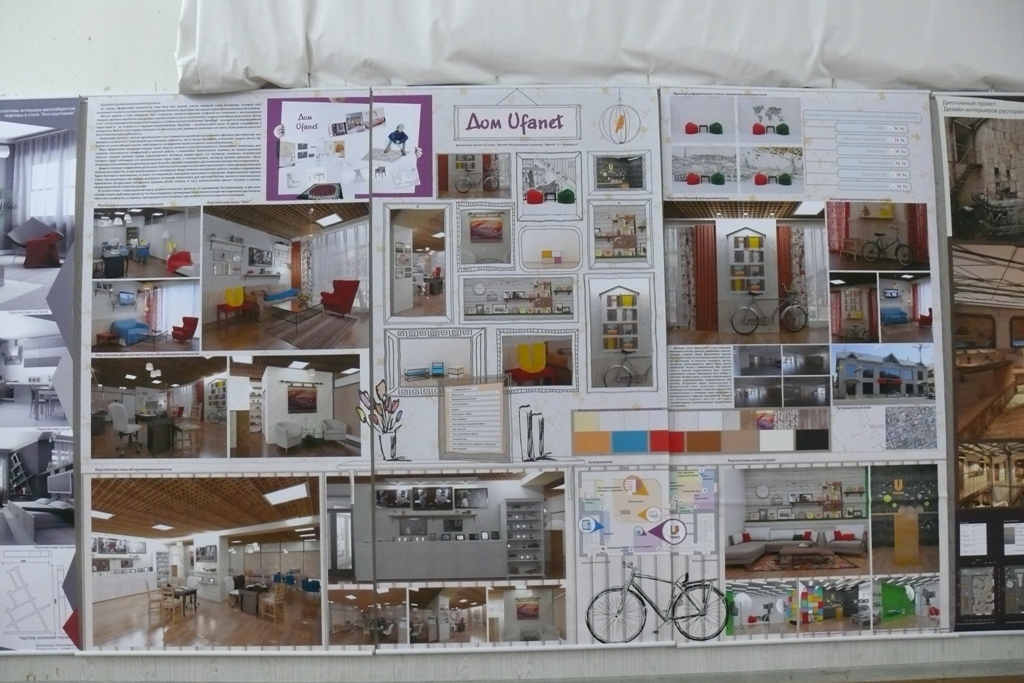 Две дипломные работы в процессе проектирования были уже реализованы: дизайн зоны обслуживания клиентов в главном офисе «УфаNET» (автор проекта Алёна Карпова), где совсем домашним и уютным интерьер стал благодаря сочетанию элементов декора стиля ретро 60-х годов, и интерьер «Музея памяти погибших в локальных войнах и вооруженных конфликтах» (автор проекта Мария Ампилогова).